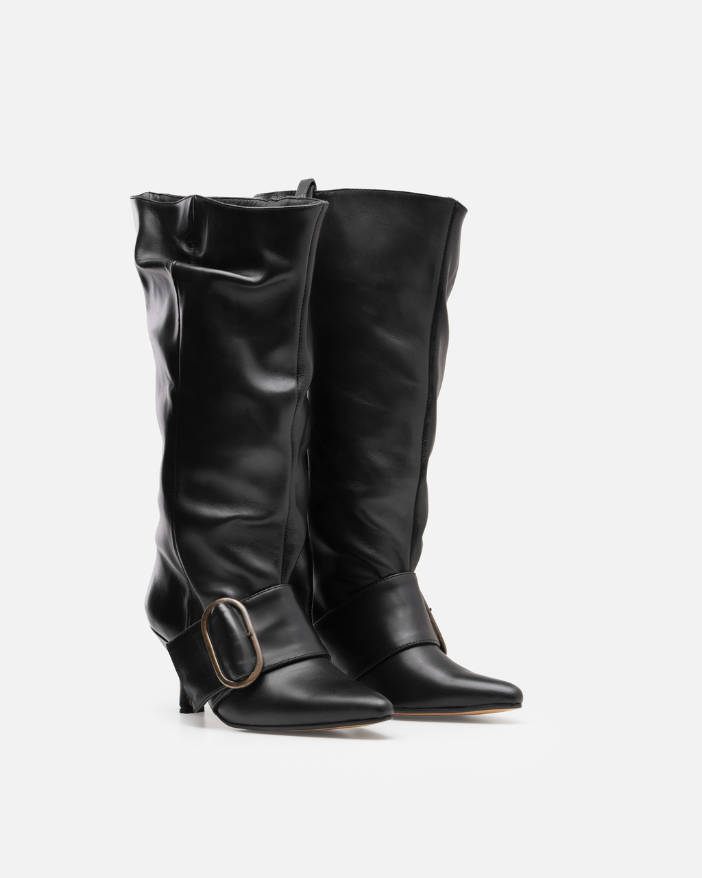 Bota con caña media-alta con cinturón desmontable. Confeccionada en cuero vacuno.
